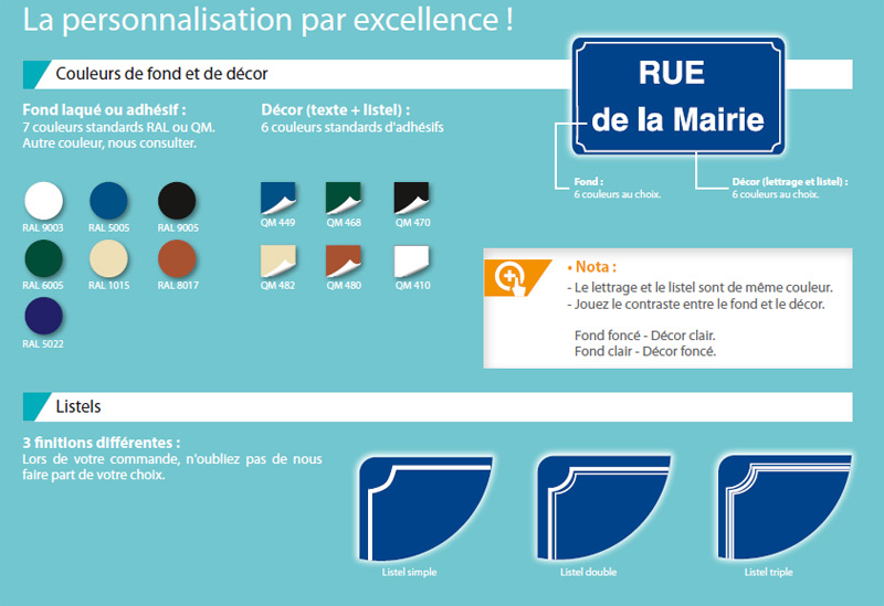 Les plaques de rue sont à fixer au mur et évitent ainsi l’ajout de supports supplémentaires sur les trottoirs. Elles sont recommandées dans les lieux urbanisés en présence de construction de type immeuble.