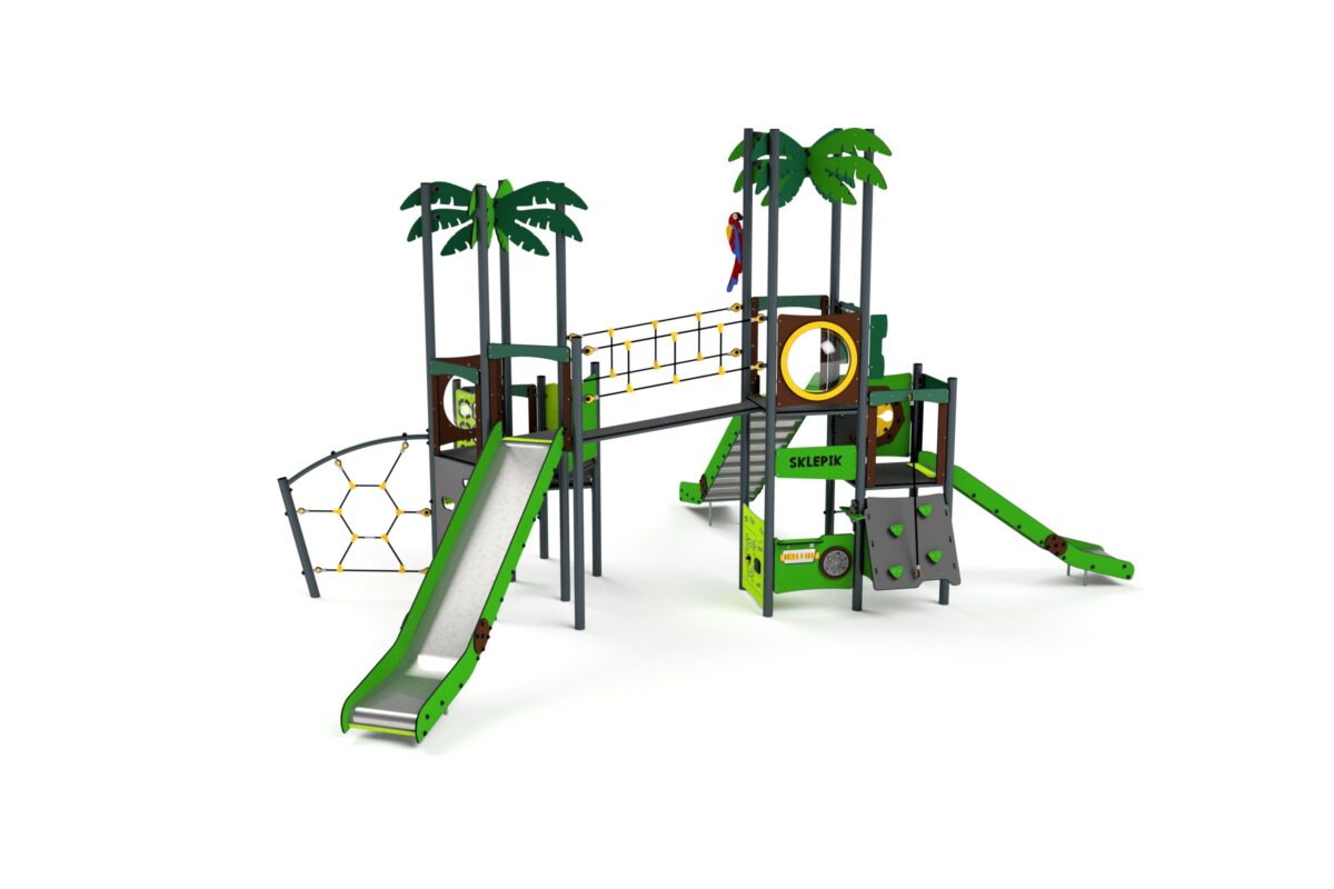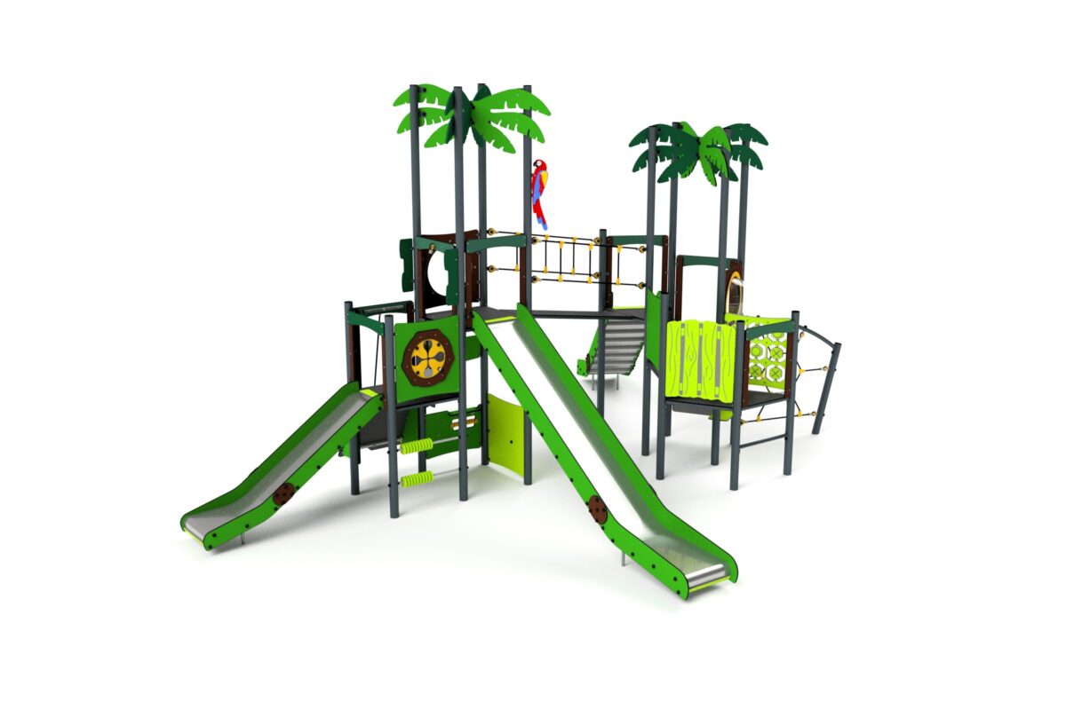 Découvrez « Tropicale 23111 », une aire de jeu exceptionnelle de notre gamme tropicale, idéale pour les collectivités telles que les mairies. Avec sa structure robuste en acier galvanisé, ses éléments décoratifs en plastique HDPE, PC et en bois peint, elle offre une expérience de jeu immersive aux enfants. Ils peuvent s’amuser en toute sécurité sur le toboggan en acier inoxydable, grimper sur les cordes en polypropylène et explorer les plateformes antidérapantes en plastique PEHD. Transformez chaque moment de jeu en une aventure exotique avec « Tropicale 23111 » !